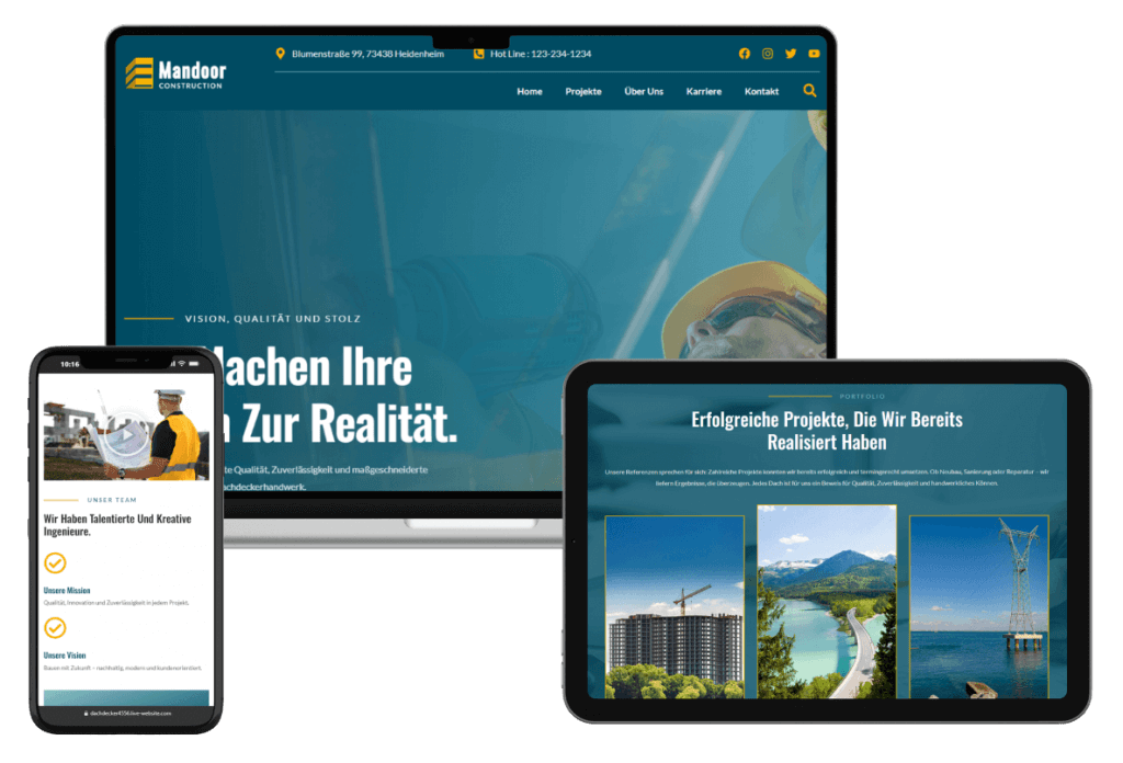 Dieses Design veranschaulicht, wie ein kraftvoller und klar strukturierter Internetauftritt aussehen kann. Markante Bilder und prägnante Überschriften betonen Kompetenz und Leistungsstärke. Es zeigt, wie eine Webseite für Bauunternehmen robust und zuverlässig wirken kann – individuell anpassbar an jedes Projekt.