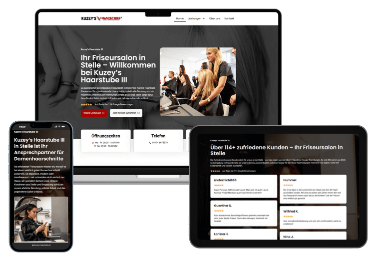 Für Kuzey‘s Haarstube III in Stelle haben wir die komplette Website neu konzipiert und technisch von Grund auf aufgebaut. Neben einer modernen Gestaltung wurden alle Leistungsseiten klar strukturiert und übersichtlich integriert. Zudem haben wir Kundenrezensionen und Referenzen direkt auf der Seite eingebunden, um Vertrauen und Authentizität zu stärken. Die Keywords wurden mit SISTRIX analysiert, und die Website ist vollständig für mobile Geräte optimiert. Abschließend erreichte die Seite bei Seobility ein hervorragendes Ergebnis – ein rundum erfolgreicher Relaunch mit sichtbarem Mehrwert.