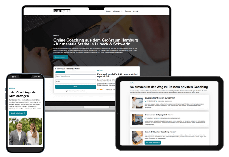 Für ResTcue haben wir zwei eigenständige Websites entwickelt: eine für professionelle Erste-Hilfe-Trainings in Unternehmen und eine für Coaching- und Beratungsleistungen im Businessbereich. Beide Seiten wurden individuell gestaltet, um die jeweiligen Zielgruppen optimal anzusprechen und die Inhalte klar zu strukturieren. Durch eine umfassende Keyword-Analyse mit SISTRIX konnten wir eine solide SEO-Basis schaffen und die Sichtbarkeit gezielt steigern. Zudem wurden beide Websites vollständig für mobile Endgeräte optimiert, damit sie auf jedem Gerät schnell und benutzerfreundlich funktionieren. Das Ergebnis: zwei moderne, leistungsstarke Online-Auftritte mit klarem Mehrwert für Kunden und Unternehmen.